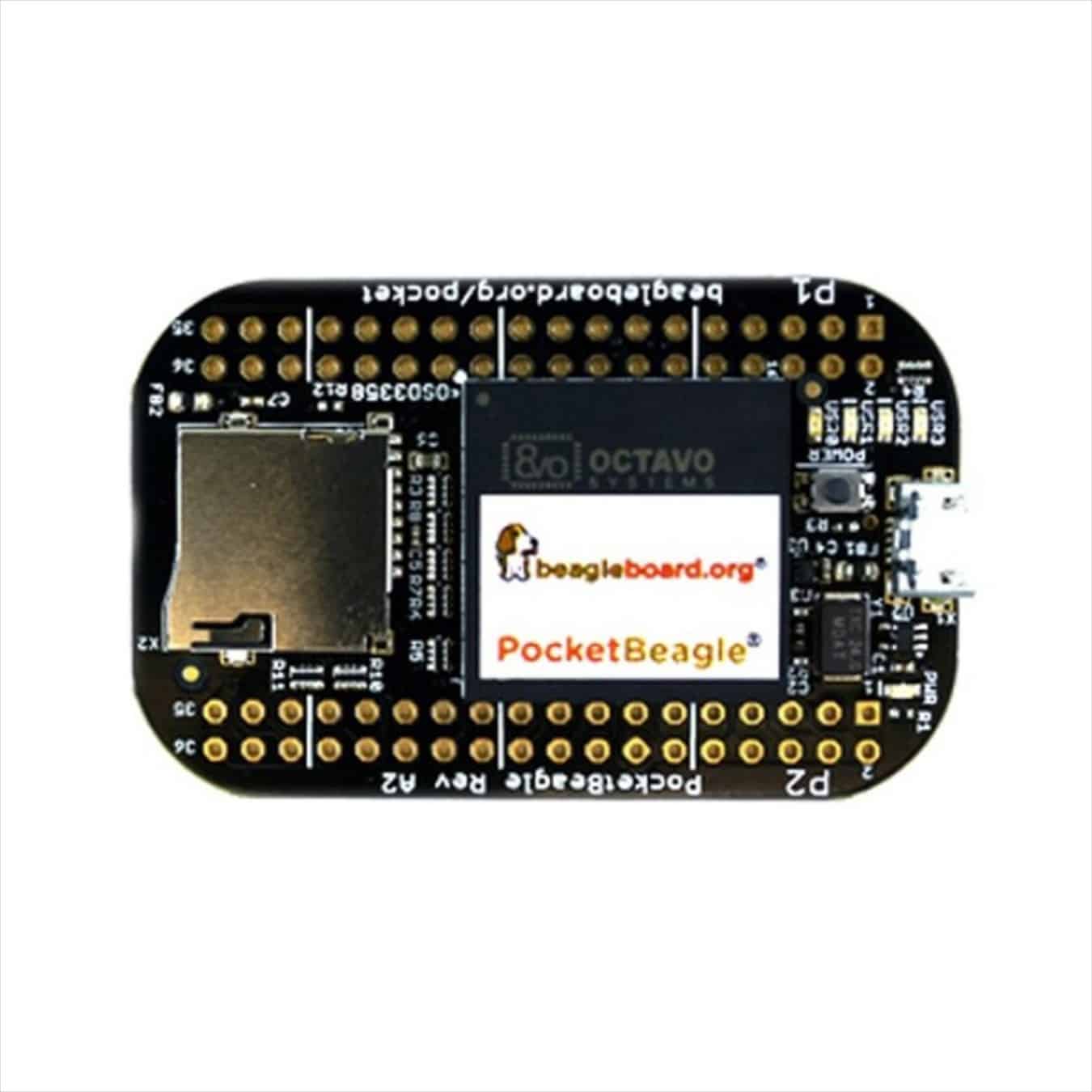 The PocketBeagle is a tiny USB-key-fob computer built around the Octavo Systems OSD3358 SoC, which includes 512 MB DDR3 RAM, 1-GHz ARM Cortex-A8 CPU, 2x 200 MHz PRUs, ARM Cortex-M3, 3D accelerator, power/battery management, and EEPROM.