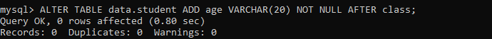 If you want to add a single column to an existing table, then this example is meant for you. Now, we will add a new column named ‘age’ at the last place of the table, ‘student’. To add a new column ‘age’ after the column ‘class’, try the below query in the MySQL command-line shell.