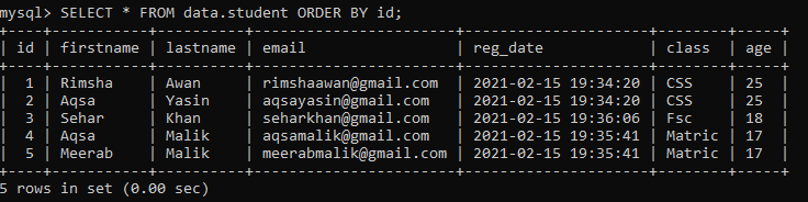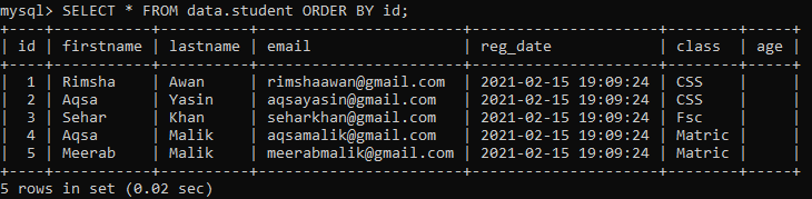 Upon checking, we have found the below-given record in the table ‘student’. Let’s add a new column, ‘age’, at the end of the table.