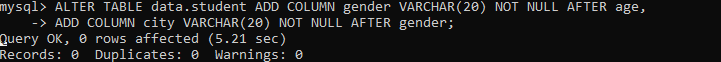 You can also add more than one column at different places of an existing table using ALTER query. Let’s try the below query to add two new columns, e.g., gender and city, at the last of all the table ‘student’ columns. We have used two ADD clauses in this query to add two columns.