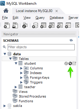 To add a new column in the existing table ‘student’, you have to navigate towards the Schemas under the Navigator. Within the database ‘data’, we have a list of tables, e.g., student and teacher. You have to expand the table, student. While hovering over it, you will find an icon of the setting, as highlighted below. Click on it to continue.
