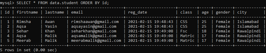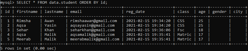 To avoid the emptiness of newly created columns, we will be adding values to new columns, e.g., gender and city. We have tried the below three UPDATE queries to add values into the columns’ gender’ and ‘city’. First of all, we have updated the column ‘gender’ using the below query as: