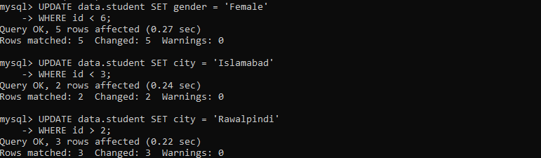 After that, we have updated the column ‘city’ by using the below two UPDATE commands: