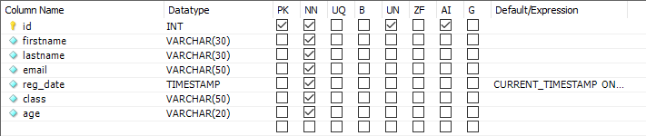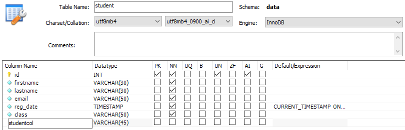 The below window will be opened in MySQL workbench. You can view a list of columns and their definitions. You can add a new column at the last of all the columns by double tapping at the last space and, after that, writing a column name on it.