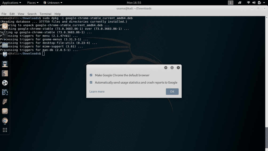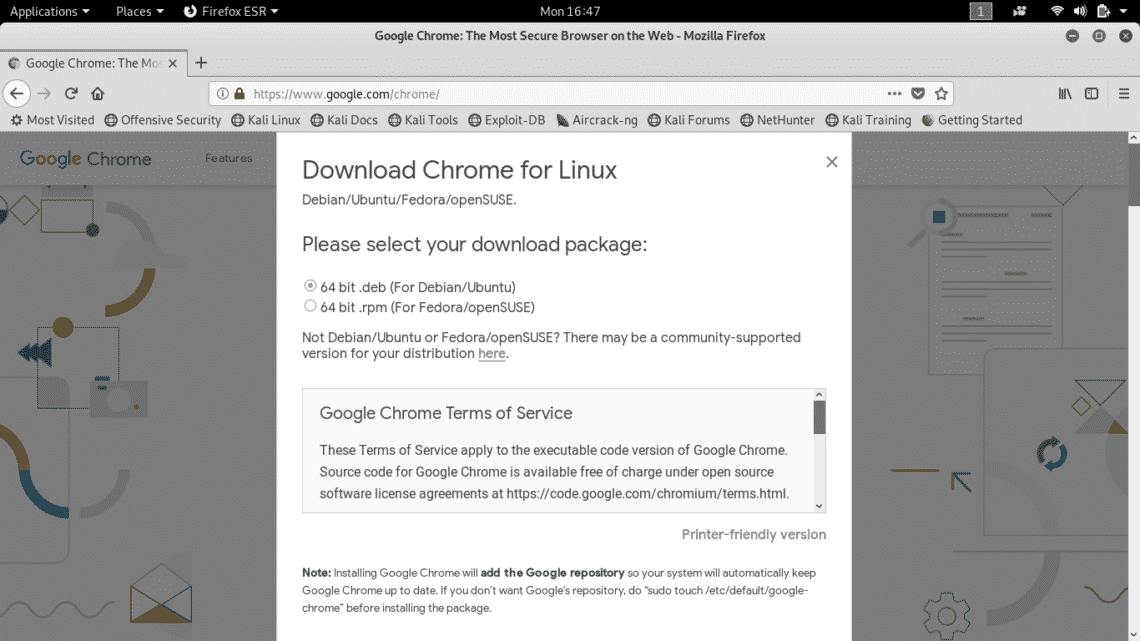 You can install Google Chrome in this non-root user. Go to Chrome’s official website and download the debian installer package “.deb” for Kali Linux and install it using package installer.