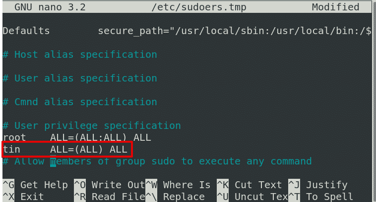 To assign a user named “tin” all root privileges, we will add the following entry in the sudoers file: