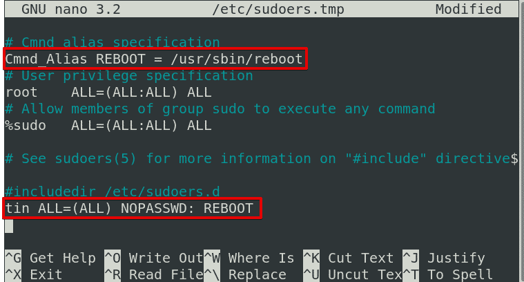 You will also need to add the entry for the user at the bottom of the file:tin ALL=(ALL) NOPASSWD: REBOOT