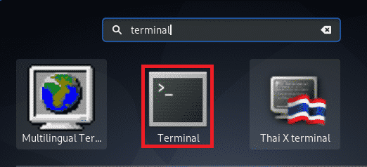 2. As soon as you will do this, a search bar will appear on your screen. Type terminal in that search bar and click on the search result to launch the terminal in Debian 10 as highlighted in the following image: