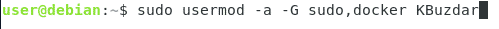 Here, you can add as many groups as you want, separated by a comma, as shown above. Replace GroupName[s] by the names of all the groups to which you want to add your user and UserName with the name of the user that you want to be added to the specified groups. In this example, I wanted to add the user KBuzdar to the sudo and docker groups. Therefore, I have replaced GroupName[s] with sudo and docker and UserName with KBuzdar. As soon as this command executes successfully, the specified user will be added to the specified groups. This command is also shown in the image below: