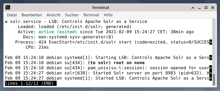The output lists the service file that was started, both the corresponding timestamp and log messages. The figure below shows that the Apache Solr service was started on port 8983 with process 632. The process is successfully running for 38 minutes.