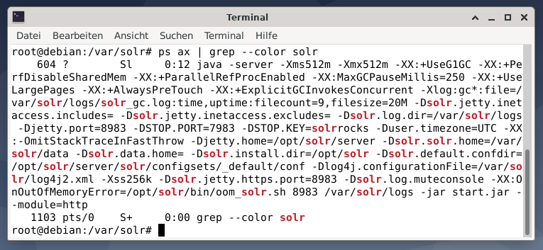 The figure below demonstrates this for a single process. You see the call of Java that is accompanied by a list of parameters, for example memory usage (512M) ports to listen on 8983 for queries, 7983 for stop requests, and type of connection (http).