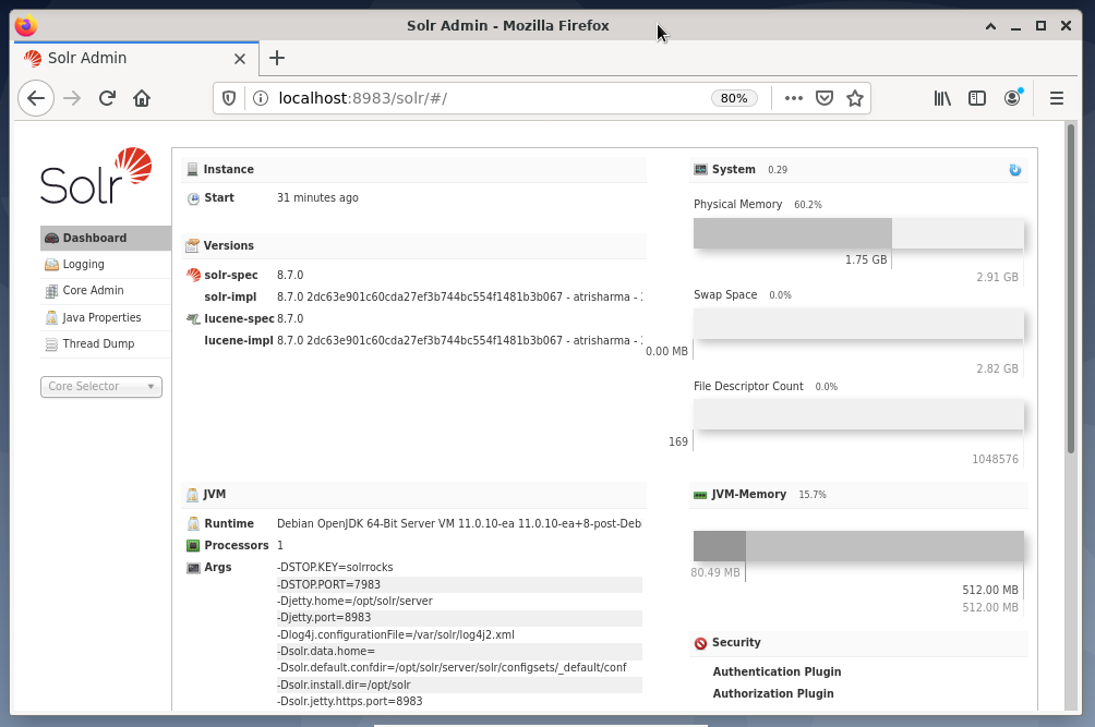 Managing Apache Solr is done using the Solr Dashboard. This is accessible via web browser from http://localhost:8983/solr. The figure below shows the main view.