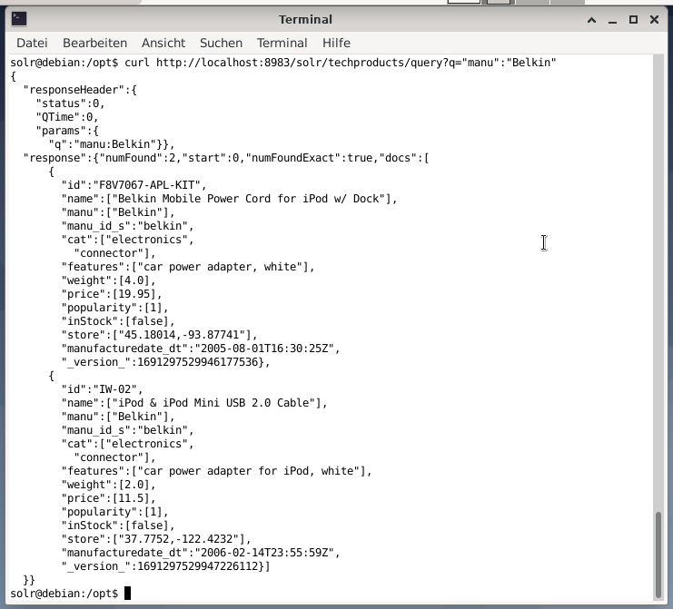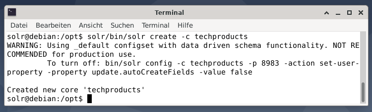 For the sake of simplicity, we use a sample dataset for the following example that is already provided by Apache Solr. Uploading documents is done as the user solr. Step 1 is the creation of a core with the name techproducts (for a number of tech items).