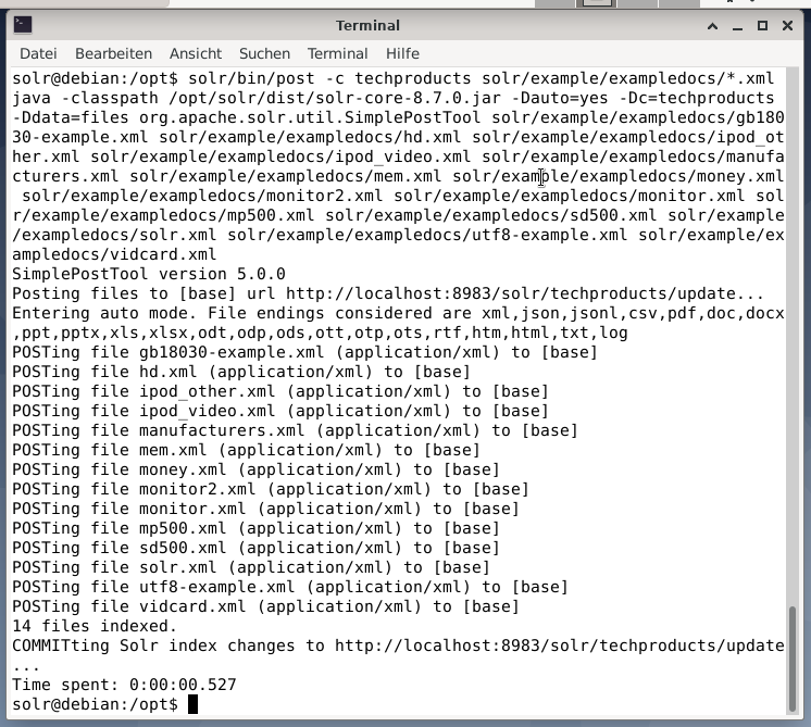 Everything is fine if you see the message “Created new core ‘techproducts’”. Step 2 is adding data (XML data from exampledocs) to the previously created core techproducts. In use is the tool post that is parameterized by -c (name of the core) and the documents to be uploaded.