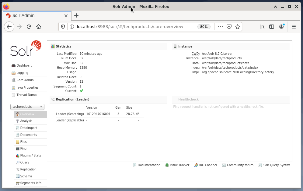 Also, the Dashboard shows the changes. A new entry named techproducts is visible in the dropdown menu on the left side, and the number of corresponding documents changed on the right side. Unfortunately, a detailed view of the raw datasets is not possible.