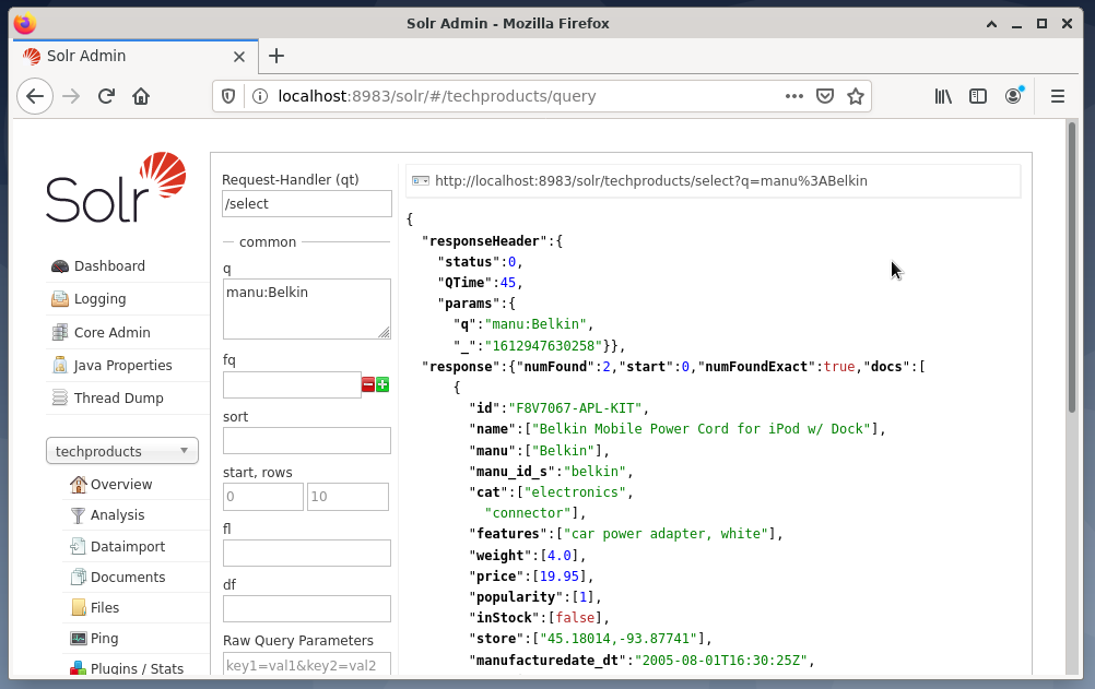http://localhost:8983/solr/techproducts/query?q=”manu”:”Belkin