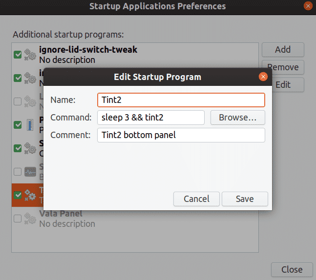 Note that Tint2 will not launch automatically on a system reboot. You will have to add it to the list of auto starting apps. To do so, launch “Startup Application Preferences” app from the application launcher. Add a new entry with the configuration shown in the screenshot below: