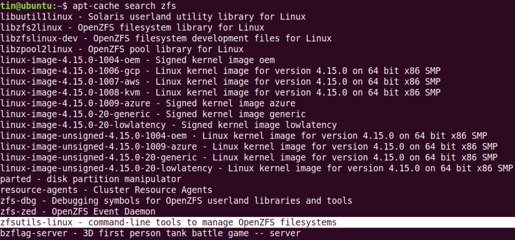 For instance, we want to install a storage management solution ZFS. To find the exact package name, let’s search it using apt-cache search as follows: