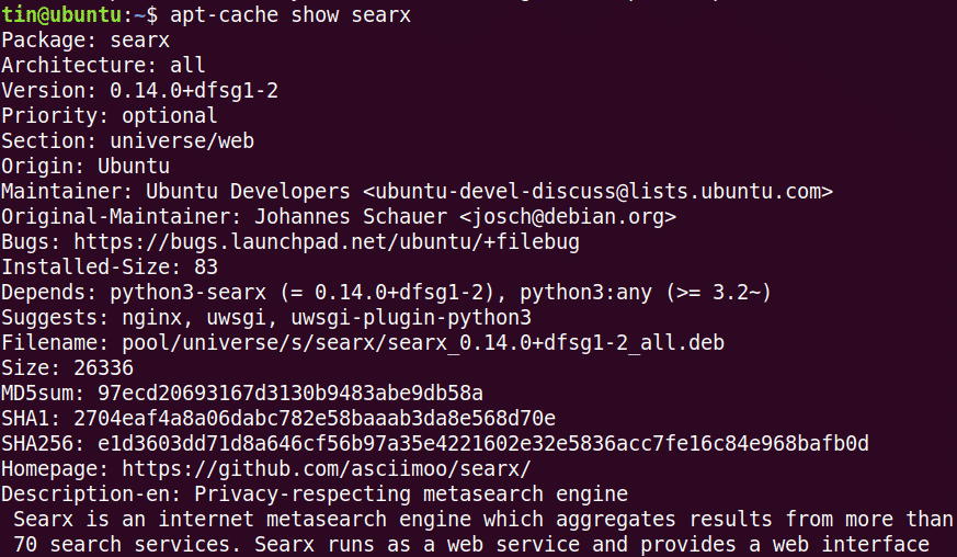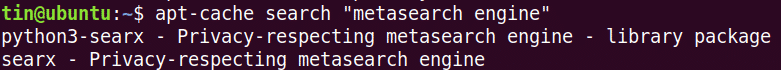 Similarly, the apt-cache search can be helpful if you want to install a web server but do not remember the name of the package. In this case, you can search for the package using any keyword related to the package description. For instance, I found it really helpful once I needed to install the search engine about which I only know that it’s a meta search engine that protects the privacy of its users. However, i did not remember the name of that search engine, so i have entered the search term as follows: