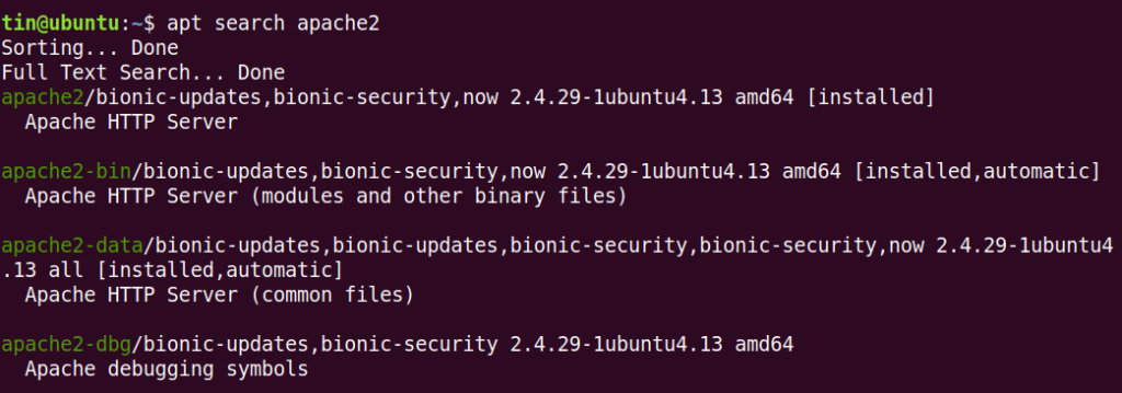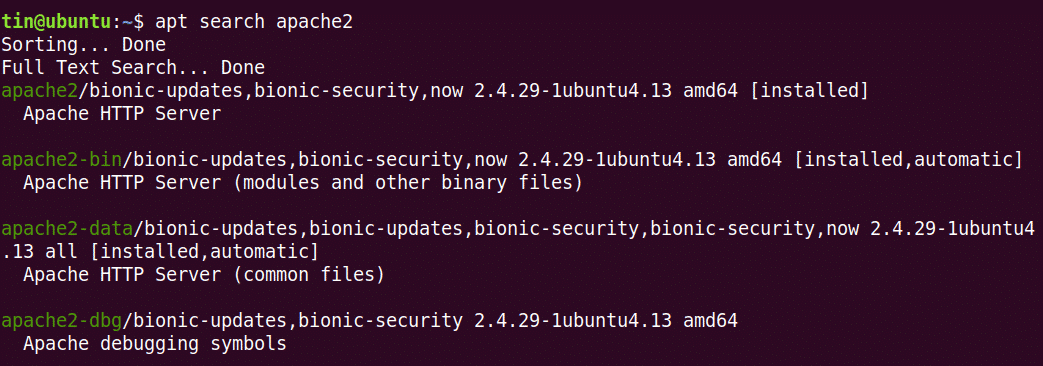 Apt search is the apt equivalent of apt-cache search in older apt-get command. Some users prefer the apt search command because of its well presented display of results. It displays the packages list along with their latest available versions and a short description. The best thing about apt search is that it highlights the packages name and maintains some space among different packages. Also, you will see the Installed label at the end of the already installed packages.