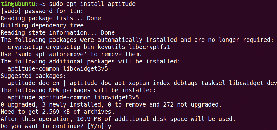 The system might ask for confirmation by providing you with a Y/n option. Hit y and then Enter to confirm, after that the Aptitude will be installed on your system.