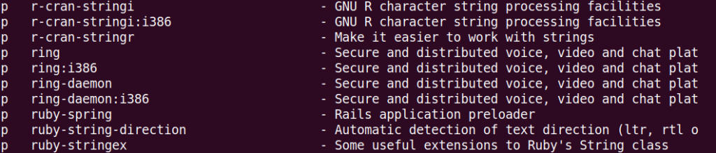 Replace the keyword with any of installed or installable package name. Note that the keyword can be exact or a part of the package name or it can be any word related to package description. In the output, you will see a list of packages matched with the mentioned keyword and a brief description of each package.