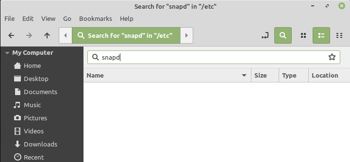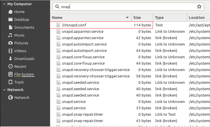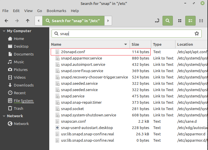 For demonstrating the usage of ‘apt-get remove’ and ‘apt-get purge’, we are making use of the snapd package in Linux Mint 20. We will first try to remove that package with ‘apt-get remove’ and show you what happens after that. And then we will reinstall the same package and remove it with ‘apt-get purge’ and reveal what happens when you will do so. The point to be noted over here is that every package that you install on Linux has a configuration file with it which either resides in the Home folder or the etc folder. The configuration file of the snapd package is located within the etc folder and you can easily find it by searching for it as highlighted in the following image: