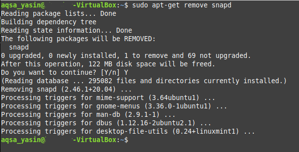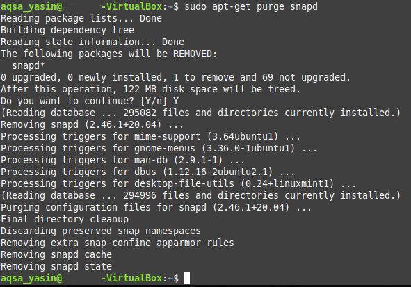 As soon as the uninstallation of the snapd package will complete, your Linux Mint 20 terminal will render the following output on it: