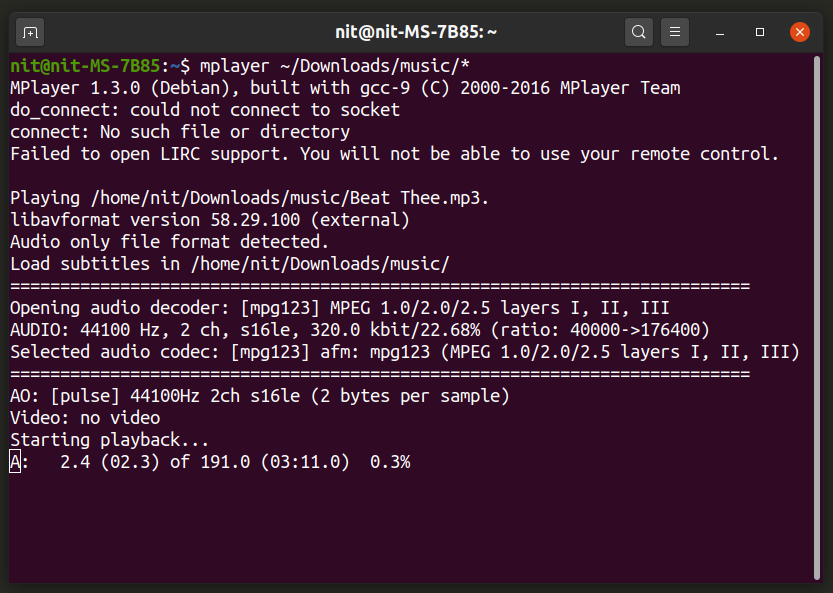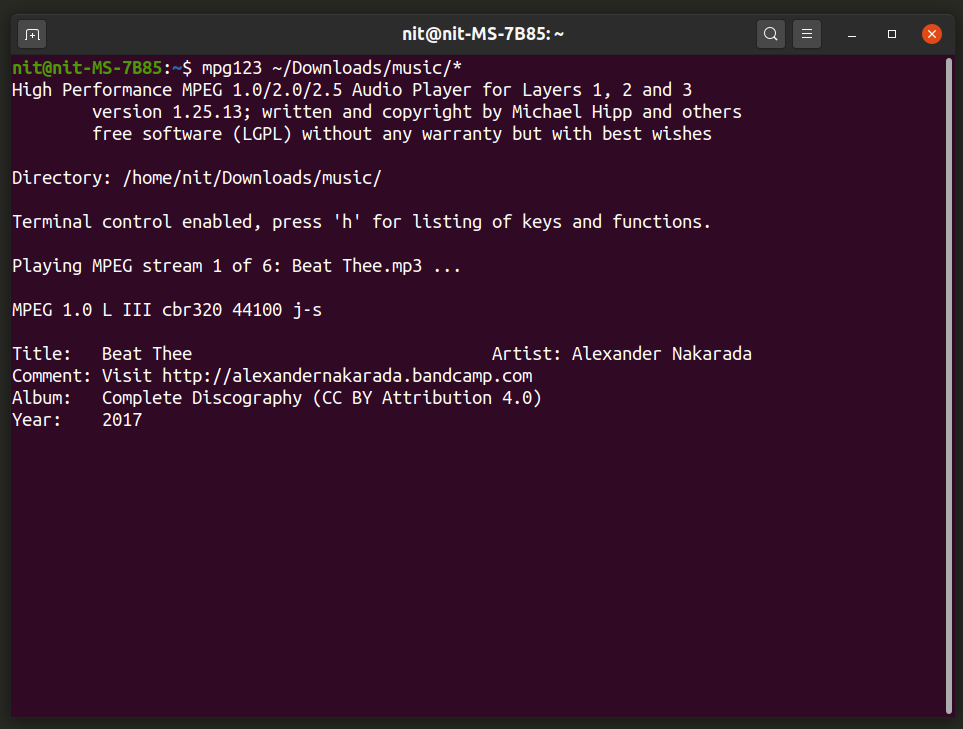 Mpv is one of the most popular media players for Linux, capable of playing both video and audio files. While videos are played in a GUI window, you can use it as a command line music player by passing the “–no-video” option.