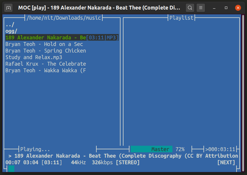 MOC or “Music On Console” is a free and open source command line music player for Linux. It allows you to play music and control playback using an interactive keyboard-driven console based layout. It works like a dual pane file manager, all you have to do is navigate to the folder where your music is stored and hit the <Enter> key to start playback. Other features of MOC include customizable color schemes, an equalizer, and user defined keyboard shortcuts.