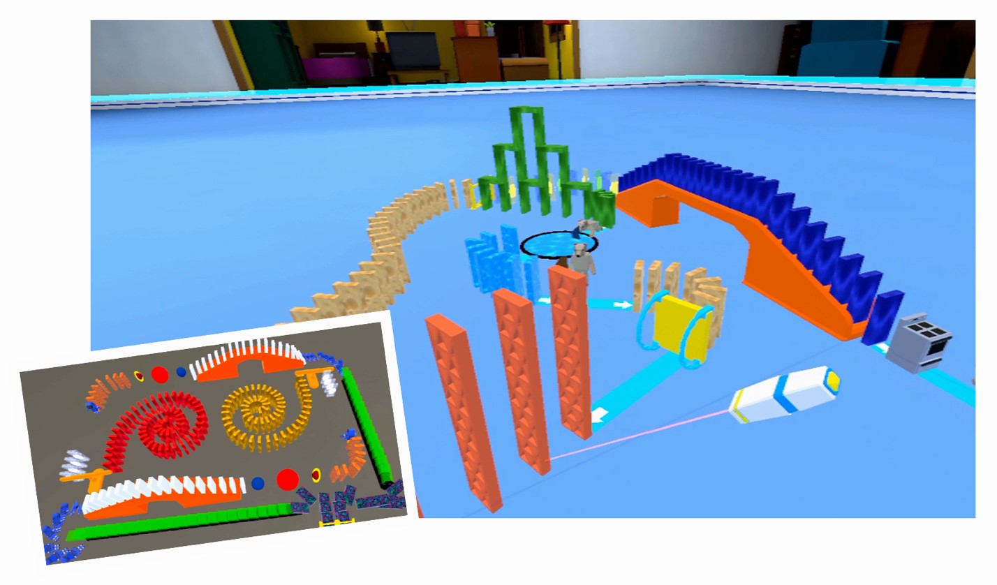 This game comprises real-world domino accessories, real-time physics, a virtual camera, saving and loading designs.