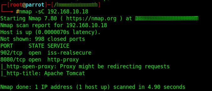 Figure 1.1 shows you a normal scan and results. The scan revealed the open ports 902 and 8080. Figure 1.2 shows you a simple service scan, which tells what service is running on the port. Figure 1.3 shows a default script scan. These scripts sometimes reveal interesting information that can be further used in the lateral parts of a pen-test. For more options, type nmap in the terminal, and it will show you the version, usage, and all other options available.
