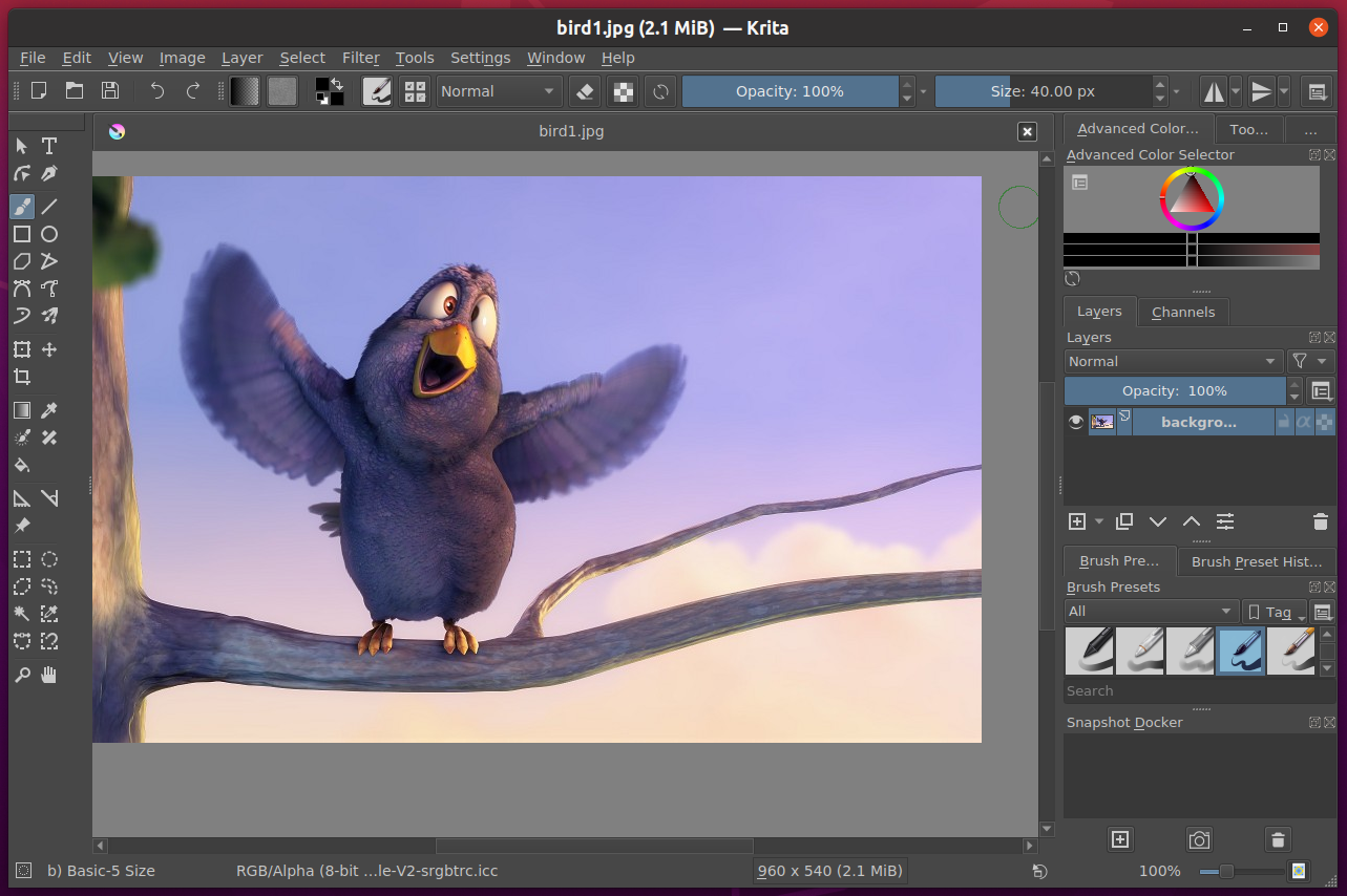Krita is an open source image editing and painting program available for Linux, Windows and macOS. It is mainly intended for artists who want to draw and create artwork from scratch. However, it can be used as an image editor to edit existing images as well. It features movable and customizable user interface elements, brush tools, text and vector tools, asset manager, animations and transitions, layers, color management tools, Python based plug-ins etc.