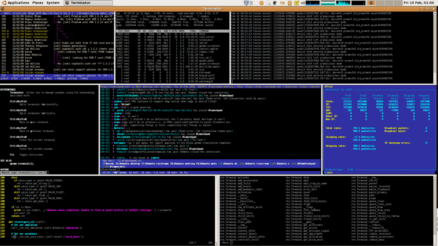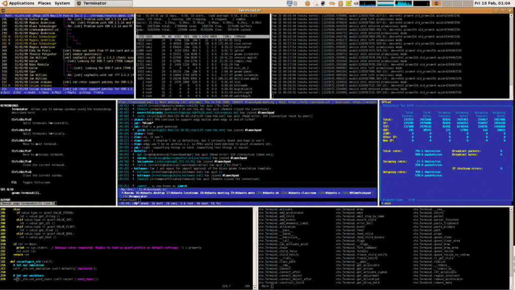 If you come up with a layout that works for you particularly well, you can save it via the GUI preferences editor and quickly load it up next time. Because the behavior of Terminator is largely based on GNOME Terminal, most users can quickly figure out how it works even without reading a manual.
