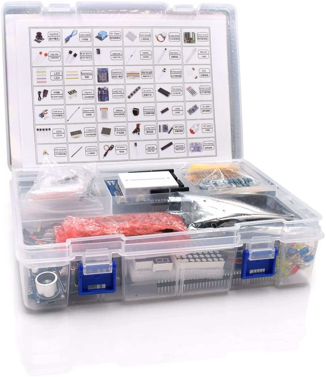 The RexQualis kit is the one with the most components out of the box. In this box you have a CD with project descriptions for an infrared controlled stepper motor a soil moisture sensor module and more. The possibilities with this kit is the biggest of them all. It is also decently priced.