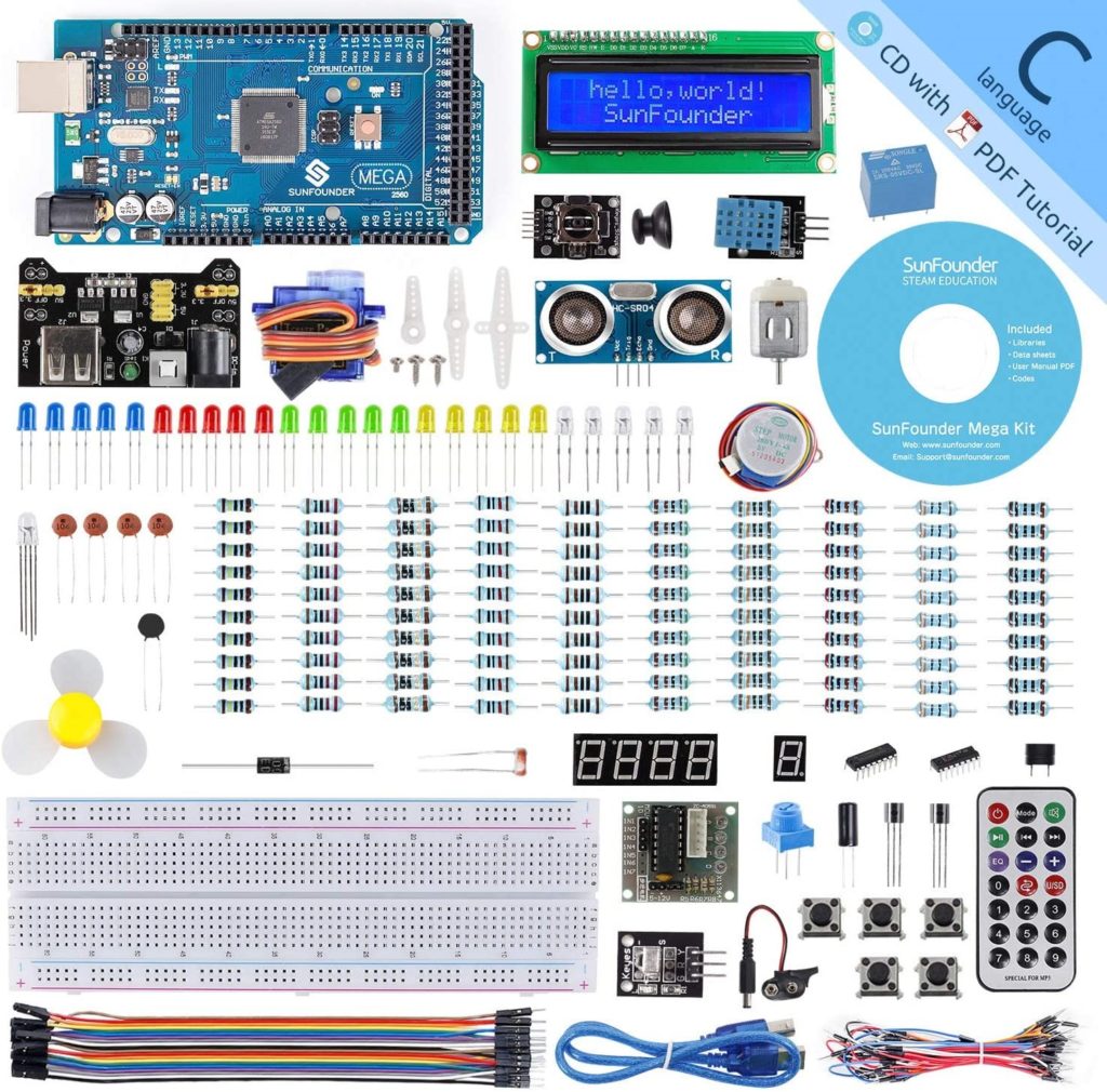 As the name states, this kit is big. It has the same as the others but have added wireless, Bluetooth, WiFi and an Ethernet shield. Packed with that and a multitude of sensors, you need to pay more for the kit. Do make sure you have a lot of energy for projects and experiments. Perhaps build a robot, there are motor drivers added for good measure. This package even includes, the UNO R3, Nano V3 and MEGA 2560.