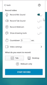 Screencastify allows multiple options for screen recording. Users can choose to record the browser tab only, their entire desktop, or just their webcam. They can also toggle their microphone on and off and select the microphone from which to record the audio for their videos. Using the embed webcam option, you can also turn on the webcam to add your face to the video.