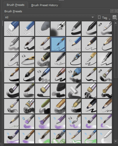 Krita also has some of the best set of brushes to work with and it’s one of the reasons why it’s known for being the perfect artist tool. Following image shows the brushes available in Krita: