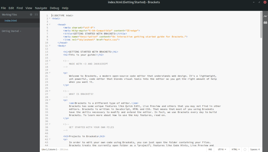 Brackets is especially popular among web developers because it allows them to connect it to a web browser so they can see all changes made to CSS and HTML on screen in real-time. With a single keyboard shortcut, you can open an inline text editor and work on a CSS file that applies to a specific ID without opening a new tab. Brackets can use Quick Edit and Live Highlight with your LESS and SCSS files to make working with them easier than ever.