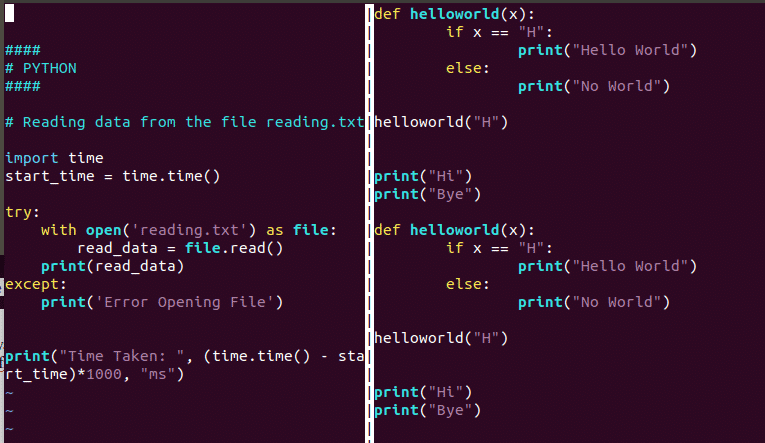 If users want to open a different file alongside their current one, they must enter the command :vsp newfileName. Again, users may navigate between the windows using Ctrl + w + w.