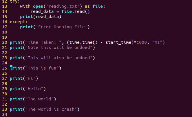 One of the best features that Vim offers is its undo tree, which includes a history of the user’s undo branches. This is a useful feature, as it allows users to move through the branches, and users can always go back to any branch. Vim makes this even more useful by also allowing users to save their undo history to their filesystem, which remains stored even if the file is edited later on. Users can move through these branch changes using the command g-, which moves you back to the previous change and g+, which makes the user go to the final state. In addition, users can use the commands :earlier and :later alongside some number, which will move through the branches according to the amount specified by the number.