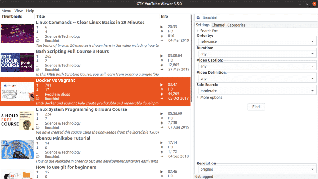 Youtube-viewer / Gtk-youtube-viewer is a lightweight application for searching and streaming videos from YouTube. Written in Perl, this app supports playing videos in a player of your choice and allows you to fine tune search results using all the typical filters available in the official YouTube website. It can display video metadata like video length, number of views, likes and dislikes and comments. It also allows you to log in to your YouTube account enabling two way sync.