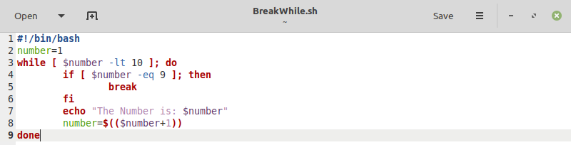 In this script, we have defined a variable named “number” and initialized it with the value “1”. Then we have a “while” loop whose iterating condition is that the value of the variable “number” should be less than 10, i.e., this loop will keep iterating until the value of the “number” variable is less than 10. Then in the do-done block, we have an “if” statement whose condition is that whenever the value of the “number” variable will be equal to “9”, our “while” loop will break. Otherwise, it will keep running. Then we have simply printed the value of the “number” variable for each iteration of our “while” loop. Finally, we have incremented the value of our “number” variable, i.e., the value of our “number” variable will exceed one after every iteration of our “while” loop. The above script will result in a situation in which the number “9” will never be printed since when the value of our “number” variable will be incremented to “9” our “while” loop will simply terminate without printing anything on the terminal.