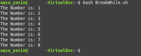 The output of this script is shown in the following image. You can easily see that the numbers printed on the terminal are from 1 to 8 and the number “9” is not printed which means that our “while” loop has terminated successfully by using the “break” command.