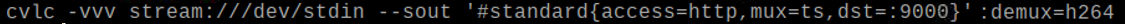 --sout '#standard{access=http,mux=ts,dst=:9000}' :demux=h264