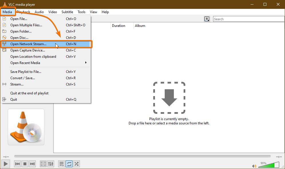 Once you know the IP address of your Raspberry Pi, open the VLC Media Player app and go to Media > Open Network Stream… as shown in the screenshot below.
