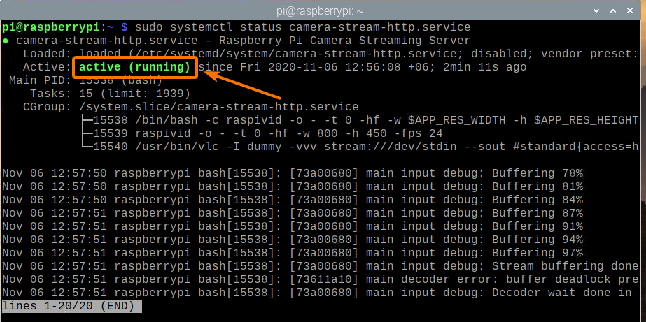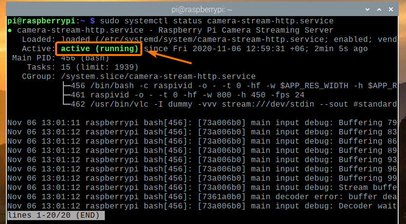 The camera-stream-http service should be active/running, as you can see in the screenshot below. So, camera-stream-http systemd service is working.