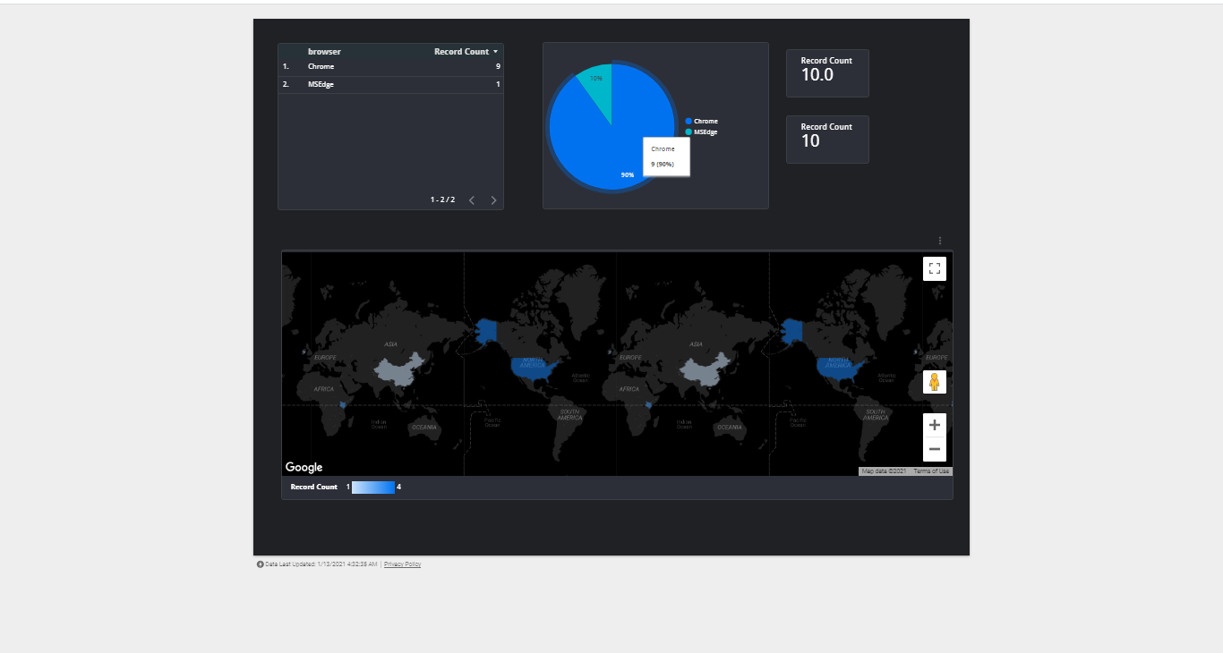 With the app running, you can randomly change your IP address and browsers to collect enough information for your database. Using the data gathered, you can use data tools such as ELK stack to visualize it and see which locations and browsers visit the application more.