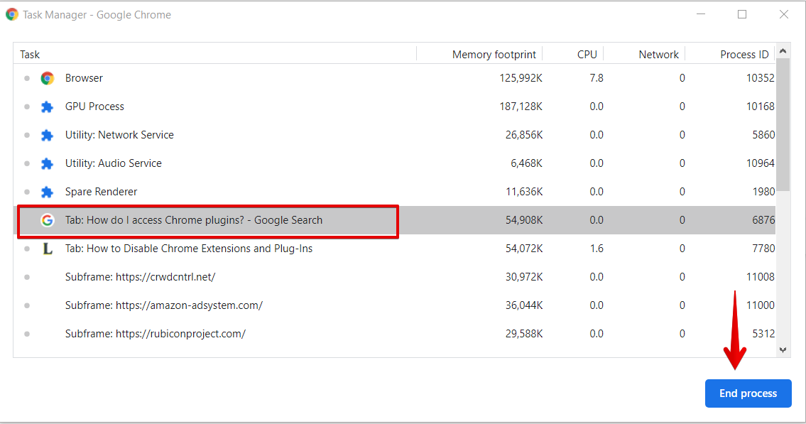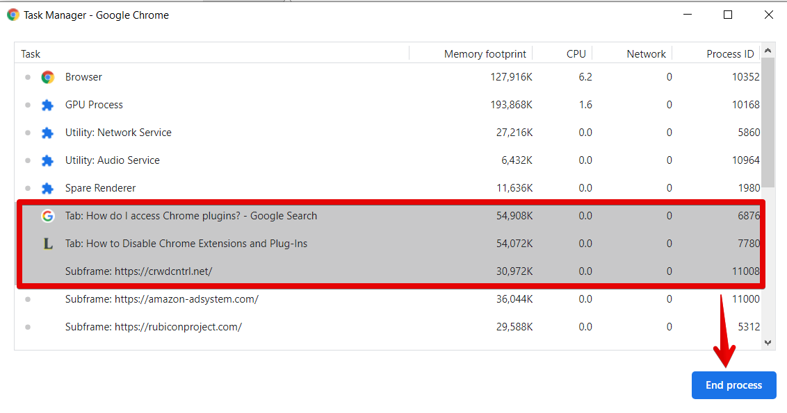 After clicking ‘Task Manager,’ the following window will appear, with a list showing all extensions, tabs, and currently running processes.