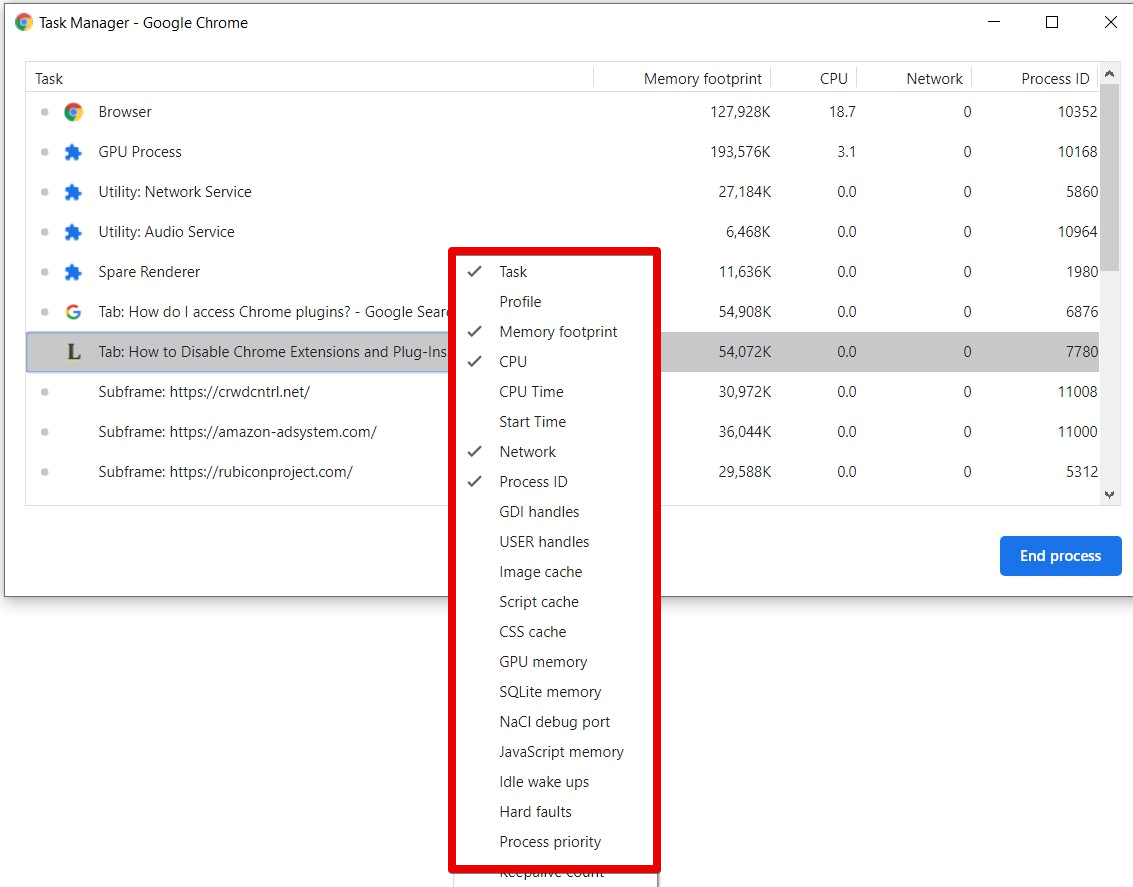 Google Chrome has over 20 different categories of stats which you can add in the Task Manager Columns menu. You can easily look at the resources that all the processes are using. To do this, right-click on the particular process, and you will see a list of the context menu stats.